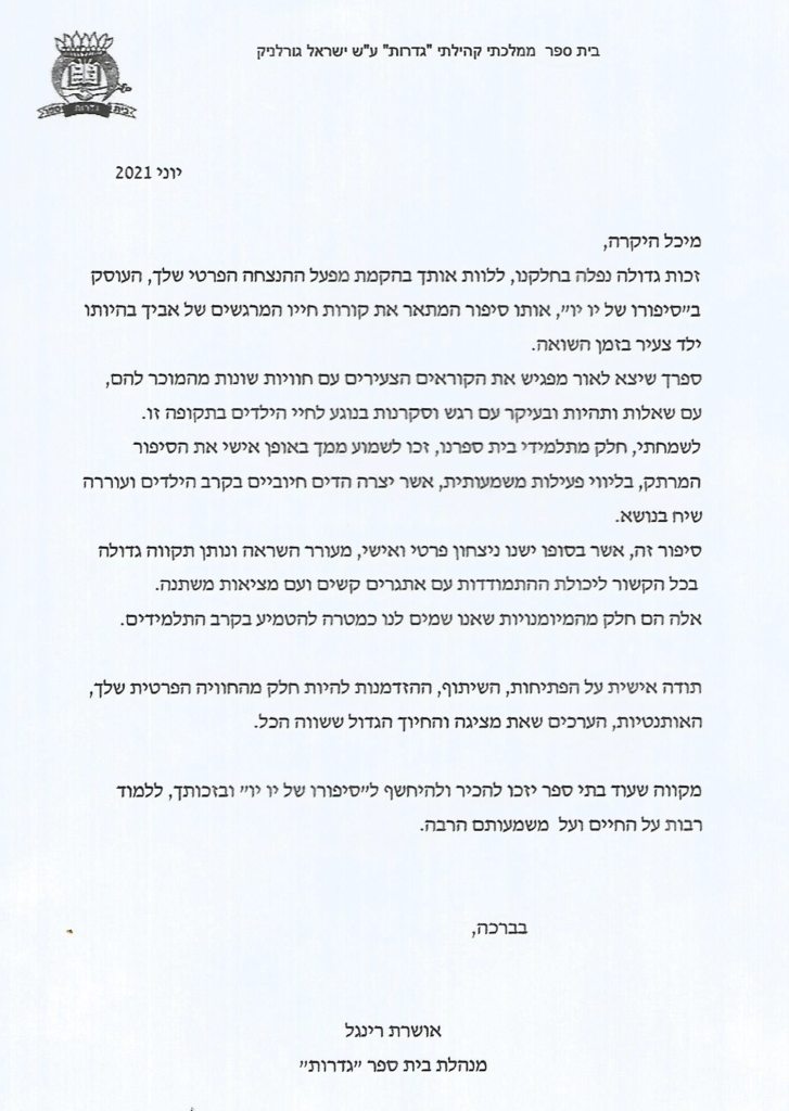 אציין בגאווה שהספר נבחר על ידי משרד החינוך ו"יד ושם" להילמד בבתי ספר יסודיים.