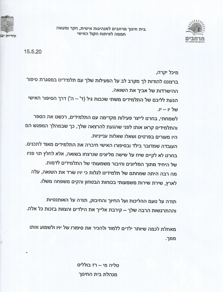 הסיפור הזה, שמחבר את התלמידים למסורת ולהיסטוריה היהודית, מעורר חשיבה מוסרית, זהות יהודית וישראלית, ומדגיש את חשיבותו של המשך השרשרת הבין-דורית.